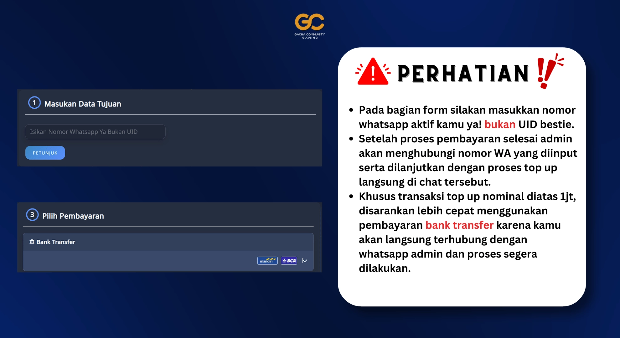 NOTE : SILAKAN MENGINPUT NOMOR WHATSAPP AKTIF KAMU UNTUK ADMIN HUBUNGI YA!, PROSES TOP UP DILAKUKAN MELALUI WHATSAPP.